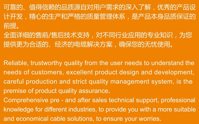 (4)材質(zhì)選擇嚴(yán)謹(jǐn)。99.999%無(wú)氧柔細(xì)銅絲,抗拉金屬導(dǎo)體,高檔滌棉,新型高分子抗拉纖維填充,造就了電纜的高品質(zhì)。特種TPV,TPE,TPU,PE全為進(jìn)口材質(zhì),高強(qiáng)度特種丁腈復(fù)合料,均優(yōu)于同行。耐磨耐油性能極好,護(hù)套緊密度高。目的就是保證電纜使用壽命更長(zhǎng)。